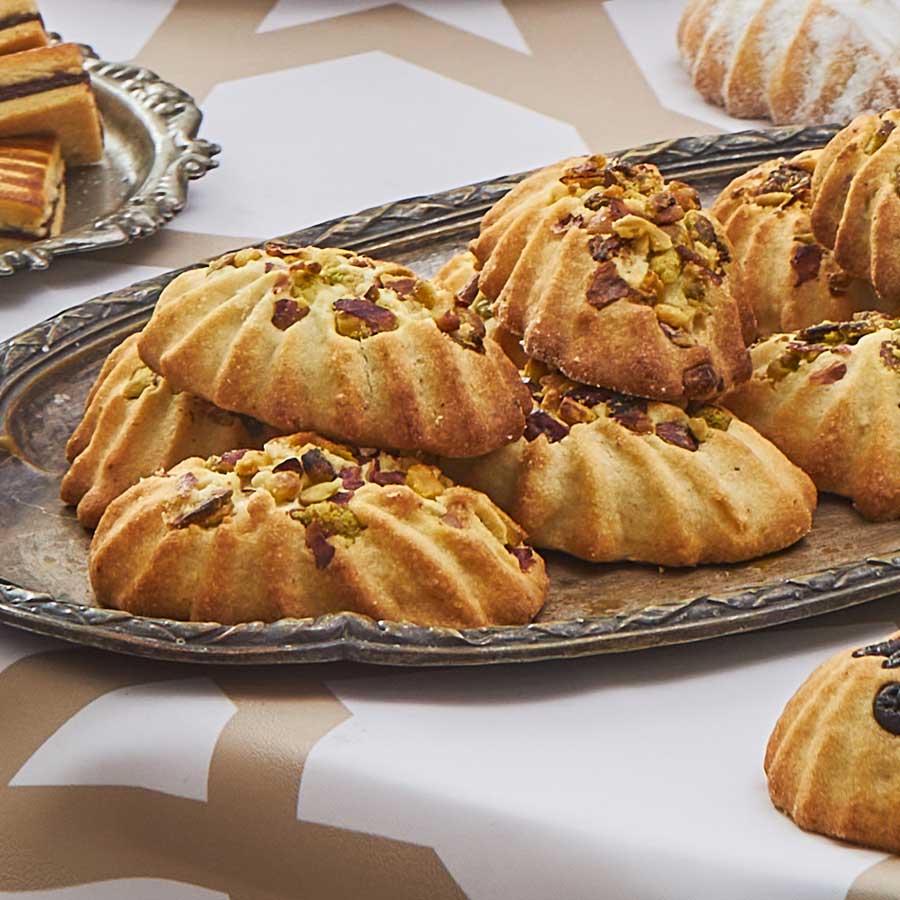 يجمع معمول الفستق لدينا بين أفضل ما في العالمين: القوام الزبدي الغني لعجينة المعمول ونكهة المكسرات الشهية للفستق. محشو بمعجون التمر المجدول الفاخر من مزارعنا، هذه الحلوى هي قضمة فاخرة توازن بين حلاوة التمر الطبيعية وقرمشة الفستق الغنية.